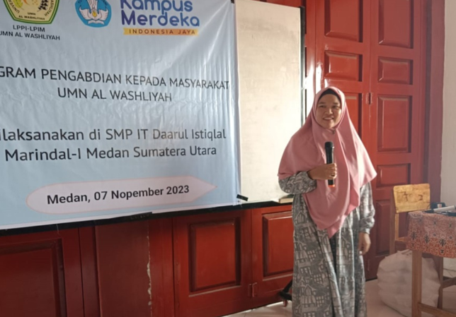 Ibu Julianingsih, S.Pd, M.Si selaku kepala sekolah SMP IT Daarul Istiqlal memberikan apresiasi dukungan dan motivasi untuk kegiatan Pengabdian Kepada Masyarakat (PKM) yang sedang berlangsung dan beliau juga menuturkan “kegiatan seperti ini sangat dibutuhkan oleh guru-guru kami semua. Saya mewakili guru-guru yang berhadir disni, sangat berterima kasih dan bangga kepada Kampus UMN Al Washliyah yang telah melaksanakan pengabdian kepada masyarakat disekolah kami yang tercinta”.